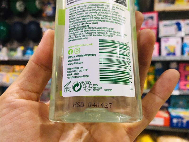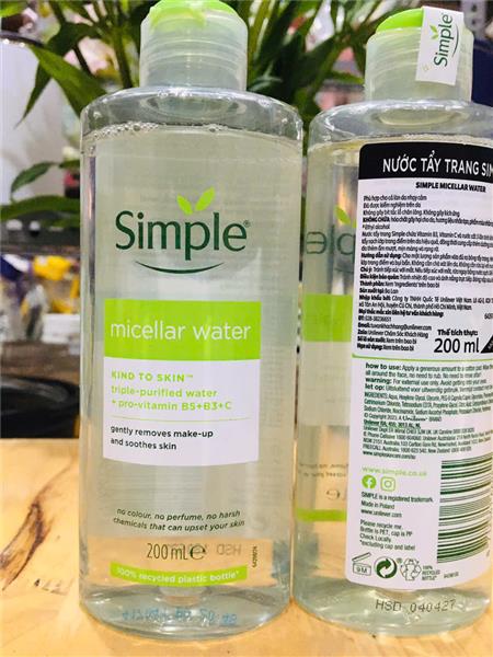 - Nước Tẩy Trang Simple Dịu Nhẹ Làm Sạch Lớp Trang Điểm Và Cấp Ẩm Cho Da 200ml với hàng triệu bong bóng thông minh giúp loại bỏ bụi bẩn và làm sạch lớp trang điểm hiệu quả, giữ ẩm cho da lên đến 4 giờ.