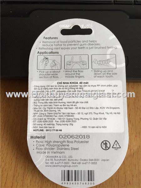 - Công dụng: Chỉ làm từ những sợi polyester tay cầm là nhựa PP chỉnh phẩm, giúp làm sạch mảng bám thức ăn dư thừa trong kẻ răng.