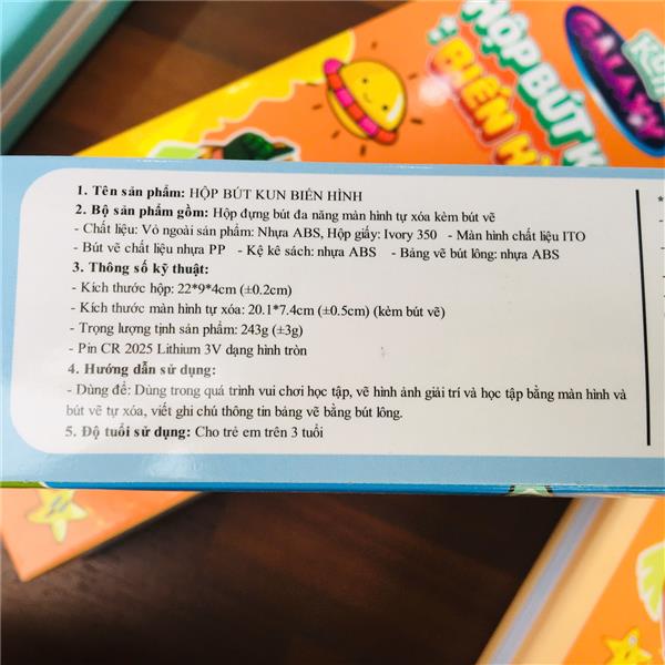 - Thành phần: vỏ ngoài sản phẩm: nhựa ABS, hộp giấy Ivory 350, màn hình chất liệu ITO, bút vẽ chất liệu nhựa PP, kệ sách nhựa ABS, bảng vẽ bút lông nhựa ABS