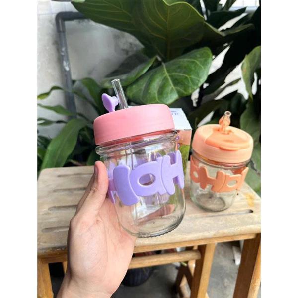 Ly Thuỷ Tinh HOHO 350ml Có Nắp, Ống Hút (KUN) Màu Ngẫu Nhiên