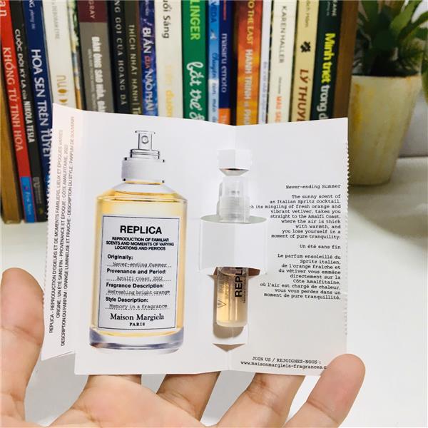 Nước hoa Maison Margiela Replica Never Ending Summer (Eau de Toilette) được ra mắt vào năm 2025, là một mùi hương cam chanh tươi mát, cay nồng lấy cảm hứng từ cảm giác của một kì nghỉ hè bất tận trên bờ biển Amalfi của Ý.