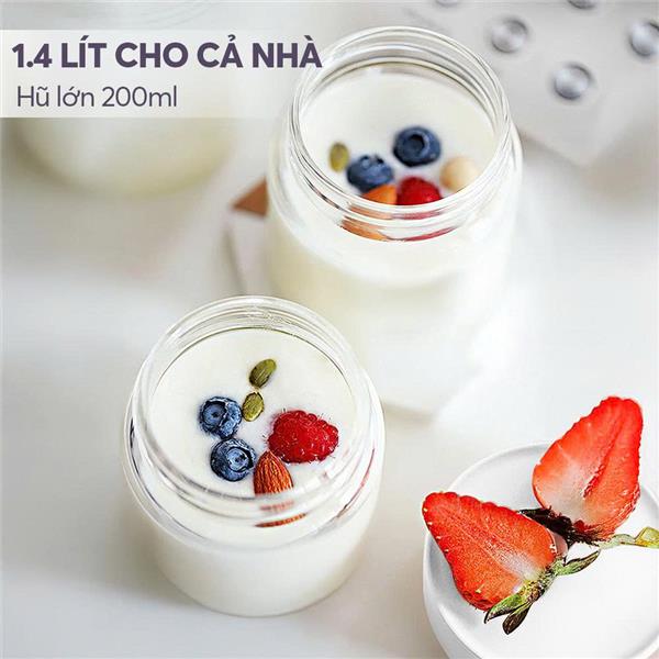 - Sản phẩm gồm: 1 thân máy, 1 nắp đậy thân máy, 7 hũ làm sữa chua, 7 nắp đậy hũ, 1 sách hướng dẫn, 1 phiếu bảo hành, 1 hộp đựng toàn bộ sản phẩm